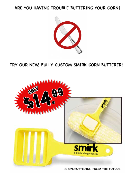 Having trouble buttering your corn? Try out brand new, fully custom championship corn butterer, ya dingus! A $49.99 value! Reduced to $14.99 because we love you! ON SALE FOR JUST $2.49! ARE WE CRAZY?!